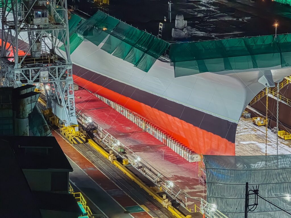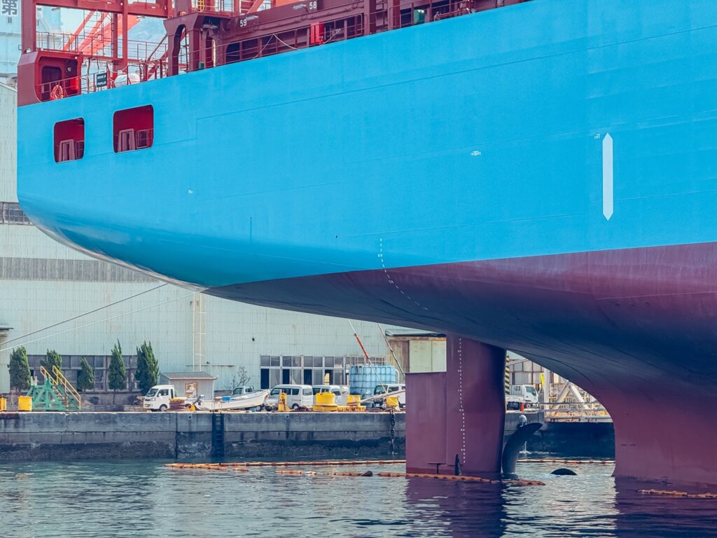 隣のコンテナ船。舵が見えるのも、メンテナンス中ならではの光景ですね。