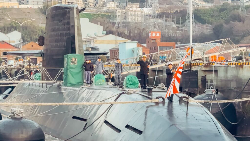 今回は、沢山の潜水艦が泊まっているということで、潜水艦の旗が降ろされるシーンを見ることができました。