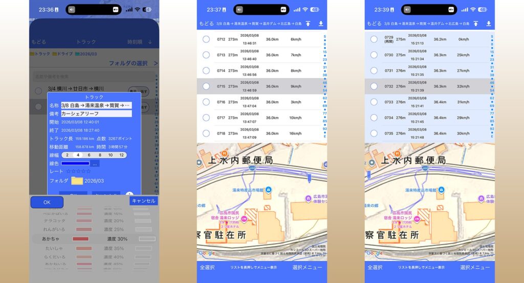 さらに、選択すると色分けを速度表記にしたり、